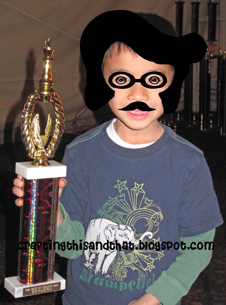 But my son and I have spent so many weekends going to chess tournaments for the last year or so. Not that he's Bobby Fischer or anything, but since he started with his school's chess club in kindergarten, he has done reasonably well at our local scholastic chess tournaments. So surprising since I don't like playing chess and am not very good at it, I feel kind of bad that I can't really play against him at home since he always beats me! Anyhow, this is him after spending all last weekend at one of the bigger chess tournaments. He was so happy to win a trophy (21st place). Lucky for him they gave out 30 trophies, usually it's 20, but this tournament had about twice as many kids as usual in his section. Anyhow, I was happy for him too since he had to play in the section with 1st through 3rd graders and after the first day, he was bawling his eyes out after losing the last game. He was even 60-something going into the 2nd day, I didn't know if he even had a chance at a trophy. I think as a parent, I was getting an ulcer for him. I used to laugh about those parents who had kids in sports and took things so seriously, but I now I know why! Even as a chess parent, I'm like checking the rankings after each game and trying to estimate where he and the school would end up for trophies. It doesn't help when most of the other parents are like that too! Anyhow, excuse my long rambling, I could go on forever about my kids! I will actually have more to post later too, I think I got quite of bit of cards done yesterday (well, actually 2 and a half which I thought was great for me).